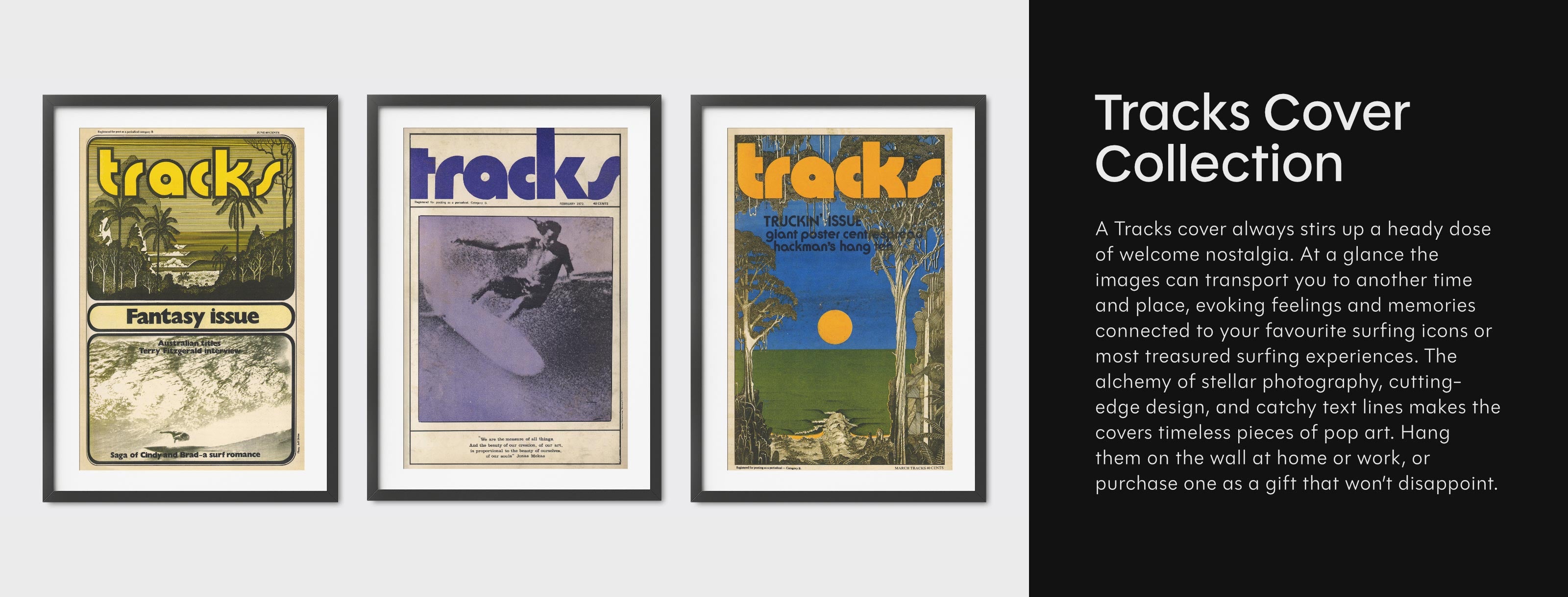 A Tracks cover always stirs up a heady dose of welcome nostalgia. At a glance the images can transport you to another time and place, evoking feelings and memories connected to your favourite surfing icons or most treasured surfing experiences. The alchemy of stellar photography, cutting-edge design, and catchy text lines makes the covers timeless pieces of pop art. Hang them on the wall at home or work, or purchase one as a gift that won’t disappoint.