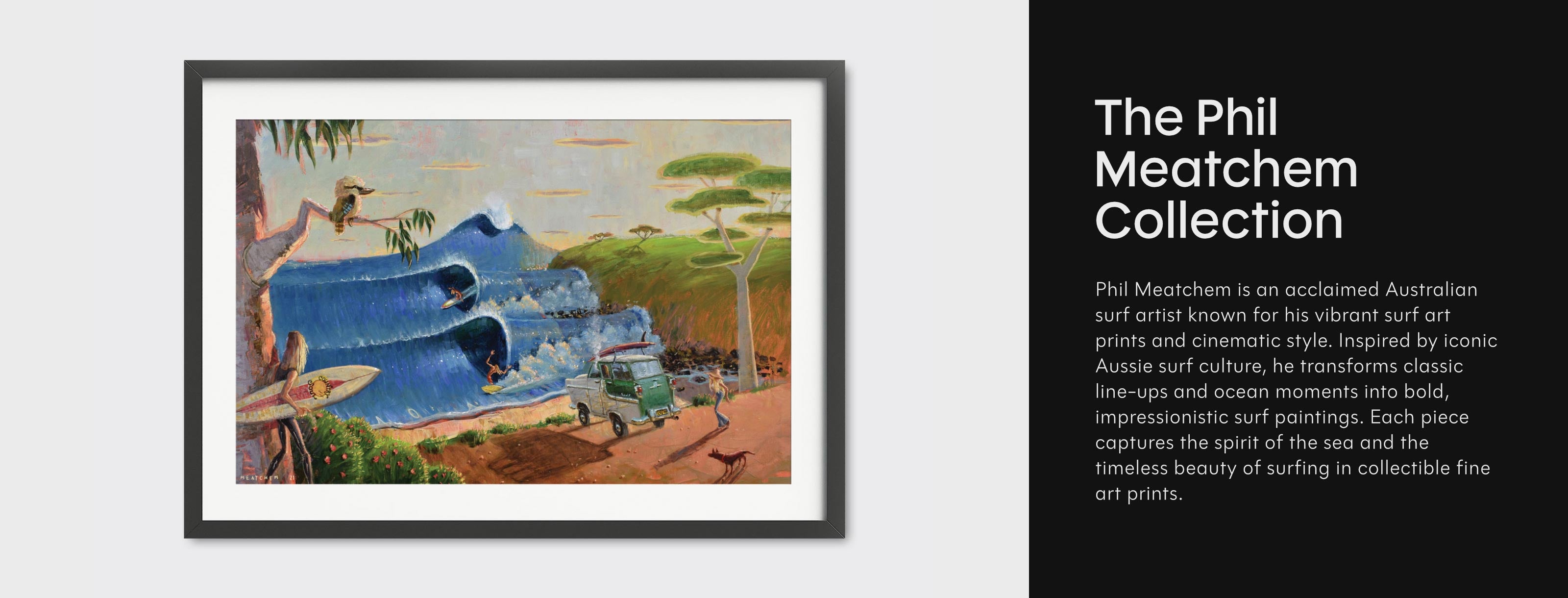Phil Meatchem is an acclaimed Australian surf artist known for his vibrant surf art prints and cinematic style. Inspired by iconic Aussie surf culture, he transforms classic line-ups and ocean moments into bold, impressionistic surf paintings. Each piece captures the spirit of the sea and the timeless beauty of surfing in collectible fine art prints.